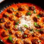 These quick and flavorful 15-minute sausage meatballs are perfect for a hearty weeknight meal. Browned to tender perfection and simmered in a savory tomato passata sauce infused with garlic, Italian herbs, and a hint of red pepper flakes, they make a delicious topping for pasta, polenta, or mashed potatoes. Garnished with fresh basil and Parmesan, this dish is both comforting and easy to prepare.