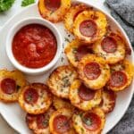 These 2 Ingredient Pizza Chips are a quick and easy low-carb snack made with just mozzarella cheese and mini pepperoni slices. Baked to crispy perfection in a mini muffin pan, they are perfect for enjoying on their own or dipping into your favorite marinara sauce. This simple recipe delivers the classic flavors of a pepperoni pizza in a crunchy, bite-sized chip.