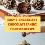 Keywords: chocolate tahini truffles, no bake truffles, healthy snack, medjool dates dessert, tahini chocolate balls, easy 5-ingredient recipe, gluten free dessert