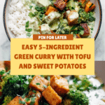 A simple and flavorful 5-Ingredient Green Curry featuring crispy pan-fried tofu, sweet potatoes, broccoli, and creamy coconut milk, enhanced with green curry paste and finished with a touch of fish sauce and brown sugar. Served over fluffy white rice and garnished with cilantro and golden raisins for a unique twist.