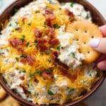A brown bowl filled with a creamy dip that has several layers: the base is thick and white with a smooth texture, mixed with finely chopped green herbs and bacon bits scattered on top, bright yellow shredded cheddar cheese spread unevenly across, and two round golden crackers partially dipped into the mix. A woman's hand with light pink nail polish is holding one of the crackers. The bowl is set against a white marbled surface, giving a clean and fresh look. photo taken with an iphone --ar 4:5 --v 7