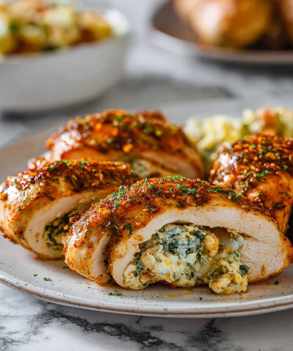 3. Stuff the chicken: Divide the prepared filling evenly among the chicken breasts, stuffing it into the pockets. Secure each stuffed chicken breast with toothpicks to keep the filling inside during cooking.