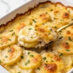 Classic Au Gratin Potatoes featuring thinly sliced russet potatoes baked in a rich, creamy cheese sauce made with cheddar and Gruyère. This comforting side dish is perfectly seasoned with garlic, onion, and fresh herbs, baked until golden and bubbly for a deliciously cheesy and tender finish.
