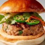 These Bánh Mì Turkey Burgers are a delicious fusion of American and Vietnamese flavors, featuring juicy turkey patties seasoned with aromatic ingredients and topped with tangy pickled vegetables and spicy mayo. Perfect for a quick yet flavorful meal, these burgers combine the fresh crunch of pickles with the heat of Sriracha and the richness of brioche buns.