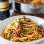 This classic Beef Ragu recipe features a rich, slow-simmered meat sauce made with lean ground beef, fresh vegetables, and San Marzano tomato sauce, served over perfectly cooked spaghetti. It’s a comforting Italian dish perfect for weeknight dinners or special occasions, garnished with fresh basil and optional Parmesan cheese for added flavor.