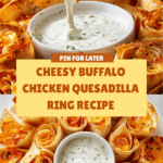 This Blooming Quesadilla Ring is a festive and flavorful appetizer perfect for parties or gatherings. Featuring a savory blend of shredded chicken, cream cheese, spicy Buffalo sauce, scallions, and a melty mix of cheddar and Monterey Jack cheeses, wrapped in mini flour tortillas arranged in a beautiful ring shape. Baked until golden and bubbly, it’s served with cool ranch dressing for dipping, combining creamy, spicy, and cheesy flavors in every bite.