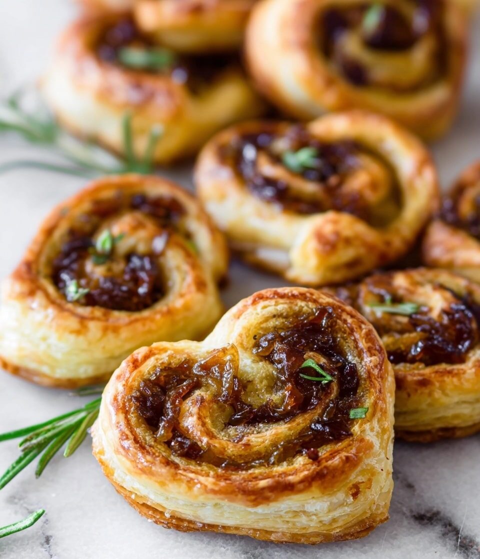 These Blue Cheese, Fig, and Caramelized Onion Palmiers are a sophisticated and savory appetizer featuring flaky puff pastry layered with sweet fig preserves, tangy blue cheese, and rich caramelized onions. Baked until golden and crisp, they are perfect for entertaining or as an elegant snack.