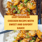 A delicious and easy-to-make Bourbon Chicken recipe featuring tender chicken cubes simmered in a sweet and savory bourbon sauce, served over fluffy white rice and garnished with green onions and sesame seeds.