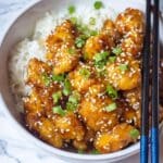 6. Serve: Plate the cooked bourbon chicken over steamed white rice. Garnish with sliced green onions and a sprinkle of sesame seeds before serving.