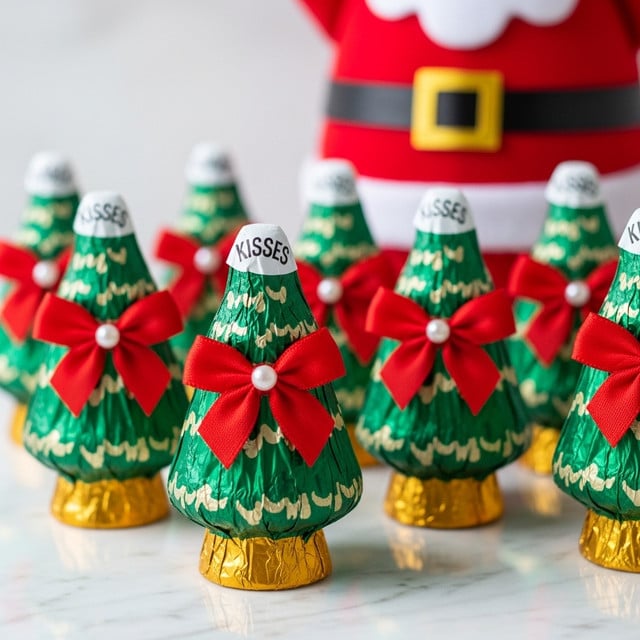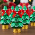 Create festive and delicious Candy Christmas Trees using green mini Reese’s Cups, Rolos, and green Kisses. These whimsical treats come together quickly with a glue gun to stack the candies into charming holiday tree shapes, perfect for party favors or holiday decorations.