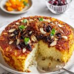This Caramelized Onion, Cranberry, and Rosemary Tahchin is a fragrant Persian rice cake that combines tender basmati rice with sweet and savory flavors. The saffron adds a golden hue and subtle aroma, while the crispy crust offers a delightful texture contrast. It’s an impressive yet approachable dish perfect for special occasions or a comforting meal.