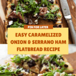 A delicious flatbread recipe featuring sweet caramelized onions paired with tangy feta cheese, savory Serrano ham, and a fresh arugula topping, finished with a balsamic glaze drizzle. Perfect as a flavorful appetizer or light meal.