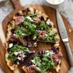 A delicious flatbread recipe featuring sweet caramelized onions paired with tangy feta cheese, savory Serrano ham, and a fresh arugula topping, finished with a balsamic glaze drizzle. Perfect as a flavorful appetizer or light meal.
