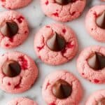 Delightfully festive Cherry Blossom Cookies feature a buttery, tender dough infused with maraschino cherry juice and almond extract, studded with chopped maraschino cherries, and topped with a sweet milk chocolate kiss. These charming cookies offer a perfect balance of fruity, nutty, and chocolate flavors, making them an excellent treat for celebrations or everyday indulgence.