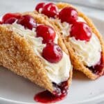 Keywords: cherry cheesecake tacos, dessert tacos, cinnamon sugar tacos, no-bake cheesecake, cherry pie dessert, fun party desserts