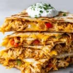 This Chicken Quesadilla recipe features tender, spiced chicken combined with sautéed vegetables and a melty blend of pepper Jack and sharp cheddar cheeses, all folded inside whole wheat tortillas. Cooked on the stovetop to golden, crispy perfection, these quesadillas are perfect for a quick lunch or dinner and served with classic sides like salsa, guacamole, and sour cream.