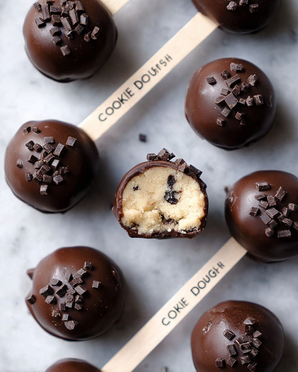 Keywords: Chocolate chip cookie dough, truffles, no-bake dessert, candy coating, party treats, bite-sized sweets