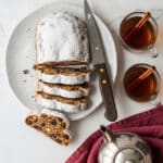 Store wrapped stollen at room temperature for up to several weeks. For longer storage, freeze well wrapped. When ready to serve, re-dust with sugar if needed. Reheat slices gently if preferred warm, but the bread is delicious at room temperature.