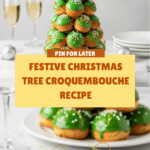 This Christmas Tree Croquembouche is a festive and impressive dessert perfect for holiday celebrations. Crisp cream puffs filled with whipped cream and coated in green icing are stacked into a beautiful edible tree, decorated with caramel strands and a star cookie topper.
