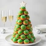 This festive Christmas Tree Croquembouche is a stunning tower of golden, cream-filled choux pastry puffs dipped in green icing and assembled with rich caramel. The delicate pâte à choux puffs are filled with whipped cream, coated in a glossy green icing, and stacked around a cone shape to create an elegant holiday centerpiece. Finished with caramel strands and a star cookie topper, this impressive French-inspired dessert is perfect for holiday celebrations and will wow guests with its beautiful presentation and delightful texture contrast.
