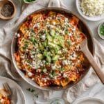 Chilaquiles is a traditional Mexican breakfast dish featuring crispy tortilla chips simmered in a flavorful salsa roja. Topped with creamy avocado, tangy crema, queso fresco, and optionally fried eggs, it’s a comforting and delicious way to start your day.