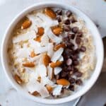 - Add Toppings and Serve: Serve the hot coconut oatmeal topped with extra shredded coconut and chocolate chips if desired. Enjoy immediately while warm.