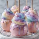 Colorful Candy Apples With Cotton Candy is a fun and vibrant treat perfect for festive occasions or a whimsical dessert. Crisp apples are coated with a glossy, colorful candy syrup and topped with fluffy cotton candy for an eye-catching and delicious combination of textures and flavors.