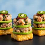 - Assemble the dish: Place the crispy rice cakes on a serving platter. Use teaspoons to form the toppings into small football shapes and slide these onto each rice cake. Sprinkle black sesame seeds over the top and optionally add jalapeño slices as garnish.
