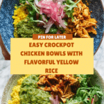 Keywords: crockpot chicken bowls, slow cooker chicken, yellow rice recipe, cilantro pesto, easy dinner, enchilada sauce chicken, healthy chicken bowls