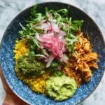 - Assemble the Bowls: Layer the bowls starting with a base of yellow rice. Add a generous scoop of shredded chicken and sauce from the crockpot. Top with salad greens, pickled onions, and a dollop of cilantro pesto. Garnish with sour cream and/or salsa if using.