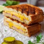 A Cuban Sandwich recipe featuring tender roasted mojo pork, Swiss cheese, honey ham, and pickles layered in Cuban bread spread with a zesty mayo-mustard sauce, then grilled to crispy, melty perfection.