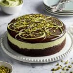 - Assemble the cake: Once the cake has cooled for at least 10-15 minutes, evenly spread the pistachio mixture over the top using an offset spatula. Then pour the chocolate ganache evenly over the pistachio layer. Garnish optionally with extra pistachio cream, toasted kataifi, or crushed pistachios for added texture and flavor. Serve warm immediately or refrigerate to allow layers to set before serving.