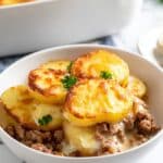Keywords: hamburger casserole, potato casserole, easy dinner, baked casserole, ground beef recipe, mushroom soup casserole