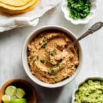 Keywords: refried beans, easy refried beans, pinto beans recipe, Mexican side dish, stovetop beans, bean dip, vegetarian beans
