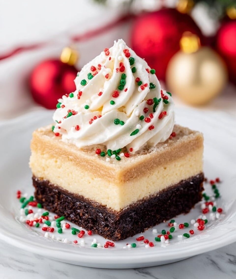 Delight in the festive flavors of Eggnog Cheesecake Brownies, combining rich, fudgy brownies with a creamy eggnog cheesecake layer topped with a swirl of eggnog whipped cream. Perfect for holiday gatherings, this decadent dessert blends the classic warmth of nutmeg and rum extract for an irresistible seasonal treat.