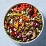Keywords: farro salad, white bean salad, roasted vegetables, healthy salad, Mediterranean salad, vegetarian salad, goat cheese salad