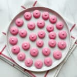 A round white plate filled with small, round, pink dollops of soft cream or batter, evenly spaced in several rows covering the entire plate surface. The plate is placed on a white marbled surface, with a folded towel underneath that has red and white checkered stripes. The pink dollops have a smooth, slightly shiny texture, looking soft and freshly made. photo taken with an iphone --ar 4:5 --v 7