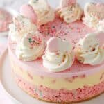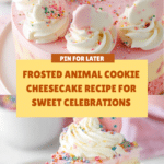 This Frosted Animal Cookie Cheesecake features a delightful crust made with crushed frosted animal cookies, a creamy and smooth cheesecake filling studded with chopped cookies, and a luscious white chocolate ganache tinted pink. Topped with whipped cream dollops, extra frosted animal cookies, and colorful sprinkles, it is a fun and indulgent dessert perfect for celebrations and cookie lovers.