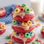 Keywords: Fruit Loop Donuts, baked donuts, cereal donuts, funfetti donuts, dessert recipe, breakfast donuts, colorful donuts