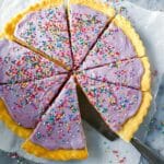 A round pie cut into seven slices with a thick crust that is golden yellow and crimped around the edges, topped with a smooth layer of light purple frosting sprinkled evenly with colorful rainbow sprinkles in red, white, green, blue, orange, and yellow. The pie sits on white parchment paper on a white marbled surface, with some sprinkles scattered around. A pie server with a black handle is partially under one slice. photo taken with an iphone --ar 4:5 --v 7