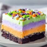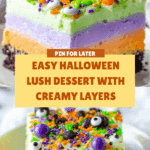 - Serve: After chilling, cut into squares and serve this colorful Halloween Lush dessert to guests and family.