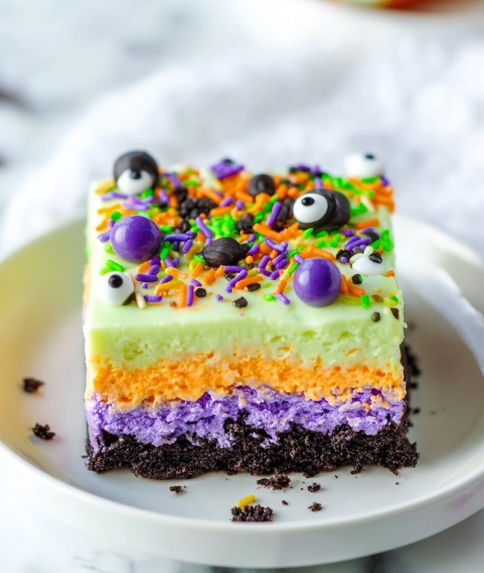 Halloween Lush is a festive layered dessert perfect for celebrating the spooky season. It features a crunchy chocolate sandwich cookie crust topped with creamy purple cream cheese mixture, a vibrant orange gelatin pudding layer, and a fluffy green whipped topping, all decorated with colorful Halloween sprinkles. This no-bake treat is both eye-catching and delicious, ideal for parties or family gatherings.