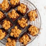The image shows a round wire cooling rack placed on a white marbled surface, holding 15 small square pieces of dark brown cake or brownies. Each piece is topped with a thick, uneven layer of chunky, creamy orange-brown spread that contains bits of what looks like nuts or fruit, giving it a textured look. The topping contrasts clearly with the dark base, and the pieces are arranged evenly on the rack. Photo taken with an iphone --ar 4:5 --v 7