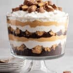 Keywords: peanut butter dessert, brownie trifle, layered dessert, Reese’s peanut butter cups dessert, easy no-bake pudding dessert