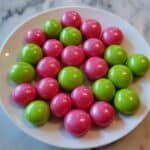 A white plate holds one layer of shiny round candies, with about half in bright pink and the other half in vibrant green. Each candy has a smooth, glossy texture that catches the light, giving them a slightly sparkly look. The candies fill the plate fully, sitting close together on a white marbled surface. photo taken with an iphone --ar 4:5 --v 7