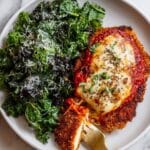 This House Favorite Chicken Parmesan recipe features tender, breaded chicken breasts fried to golden perfection and topped with a rich homemade San Marzano tomato sauce and a bubbly, golden layer of mozzarella and Parmesan cheese. Served with garlic bread and a fresh green or kale salad, this classic Italian-American dish is crispy, cheesy, and utterly irresistible.
