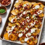 - Garnish and Serve: Immediately after removing from the oven, drizzle sour cream or crema over the nachos. Top with chopped crisp bacon and chopped chives or green onions. Serve right away for the best texture and flavor.