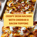 Irish Nachos are a crispy, cheesy twist on traditional nachos, made with thinly sliced potatoes instead of tortilla chips. This comforting dish is perfect as a snack or appetizer and combines crispy potatoes with melted cheddar, bacon, and tangy sour cream for a delicious treat.