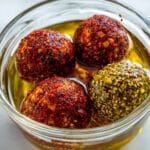 A clear glass bowl holds five round cheese balls covered in two different coatings, sitting in a golden oil. Three of the cheese balls are coated with red spices, giving them a rough, textured red surface with specks of darker and lighter red tones. The other two cheese balls are coated with green herbs and sesame seeds, making them look bumpy and greenish with yellow seed details. The cheese balls are tightly packed together, half submerged in the shiny oil that reflects light softly. The bowl is placed on a white marbled surface. photo taken with an iphone --ar 4:5 --v 7