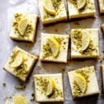 These Lemon Pistachio Cheesecake Bars combine a zesty lemon flavor with the crunch of roasted pistachios and a creamy cheesecake filling atop a lemon cookie crust. Perfectly balanced between tart and sweet, these bars are an elegant dessert that are easy to make and sure to impress.